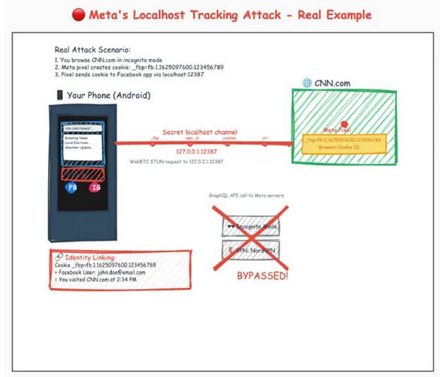 Meta’s apps were secretly opening network ports on your phone. Every time you visited a website with Facebook’s tracking pixel (which is basically every website), that site would silently send your browsing data directly to Meta’s app running in the background. Your browser’s privacy settings? Worthless. Your VPN? Irrelevant. Cookie clearing? A joke.